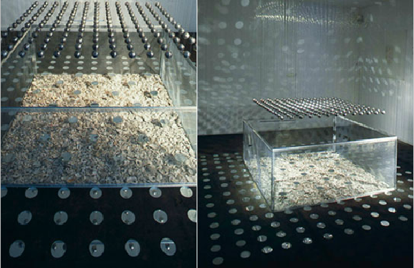 Wire lathe cage, Atlantic shells, 500 mirrors, Steel frame, lead weights, monofilament – 1998 Dimensions: Variable